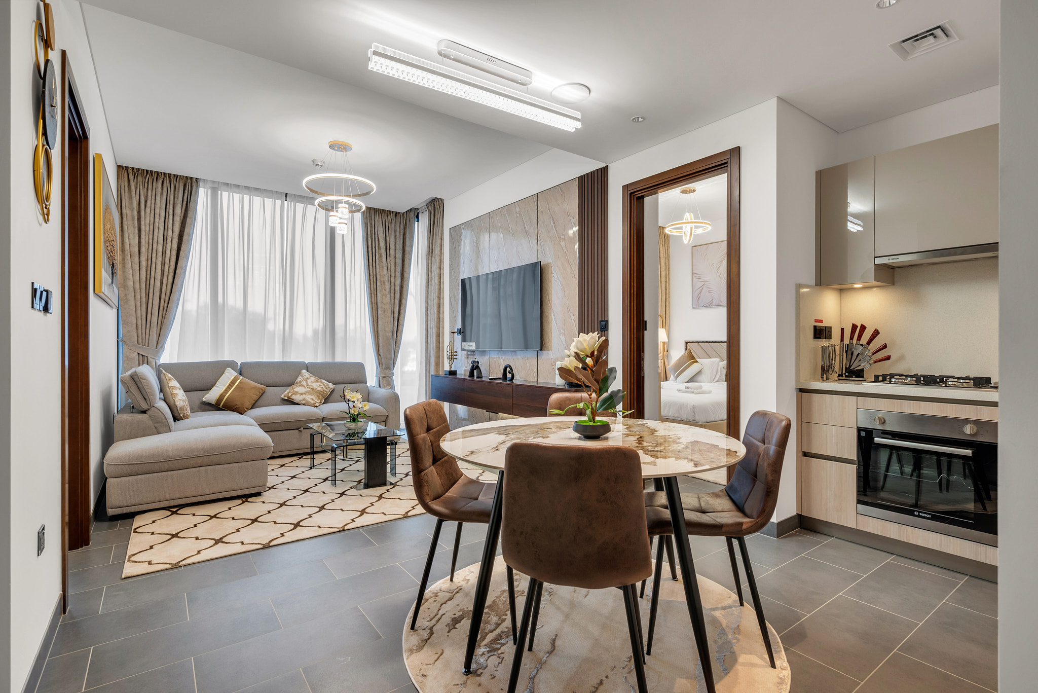 A fully furnished two bedroom apartment presented by HEP Stays and designed to deliver comfort, convenience and a seamless guest experience. The apartment offers approximately 906 square feet on the podium level with a spacious balcony facing the green landscaped areas of Sobha Hartland. Interiors are newly furnished and curated to support both short and extended stays.